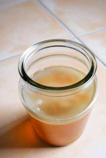 There was more scummy bits on the side of the jar, so I poured in some water raise the water level up a bit. To my dismay, the weight of the pouring water pushed down the SCOBY pillow, and because the SCOBY was still young (or the kombucha solution wasn't carbonated/airy enough), it stayed at the bottom.